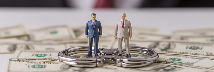 Financial crime concept: Two figurines in suits stand on handcuffs amidst scattered banknotes, symbolizing corruption and legal consequences.