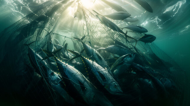 Bluefin Tuna caught up in a fishing net, Illicit trade in bluefin tuna has been facilitated by the process of catching fish with large nets that close at the bottom called seine netting