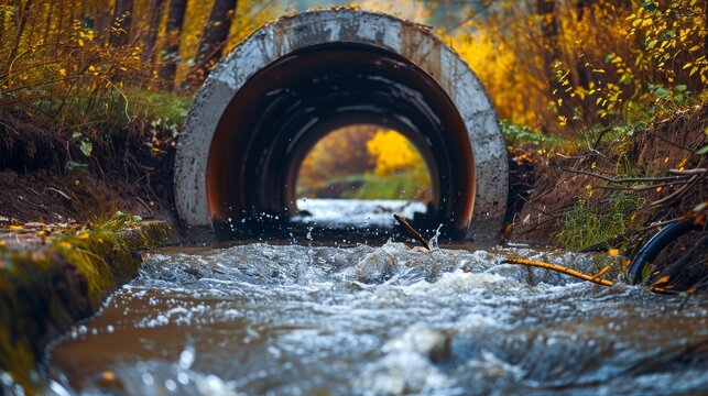 Urban water runoff flowing into a massive concrete culvert, detailed depiction of pollution and water management
