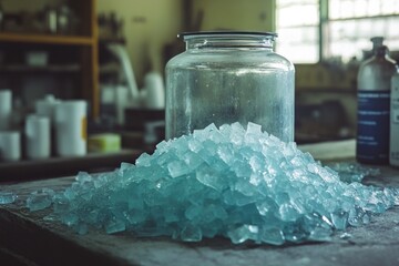 Blue crystalline substance collected in a container while preparations for illegal drug manufacturing occur in a hidden location
