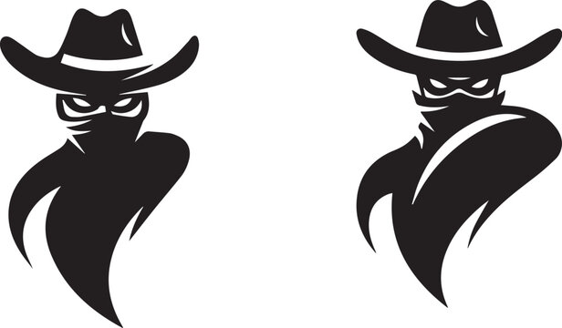 Minimalist black and white outlaw silhouette icons – mysterious masked figures with wide-brim hats and intense eyes.