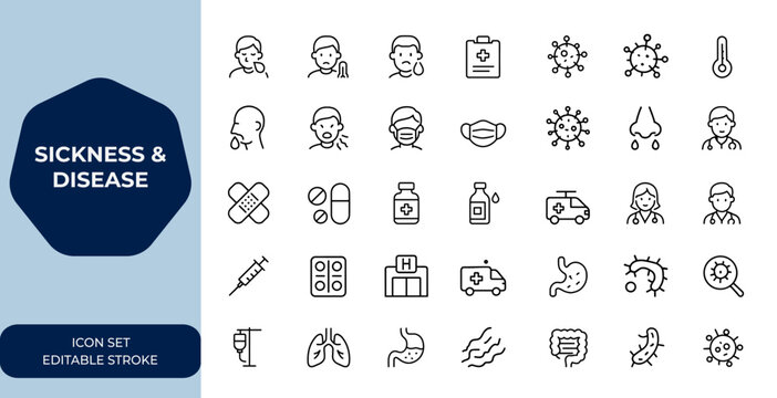 sickness and disease icon set, linear illness vector collection with editable stroke, medical health symbols, healthcare, virus, infection, symptom, treatment, doctor, hospital and more.