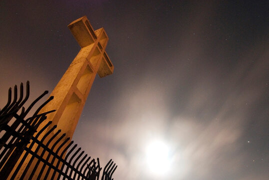 Holy cross symbolizing the death and resurrection of Jesus Christ with the sky over Golgotha Hill is shrouded in light and clouds. Apocalypse concept.