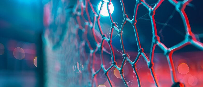 Shot of handball goal net with blurred bokeh lights in the background, illuminated in vibrant blue and red hue. Sports betting banner