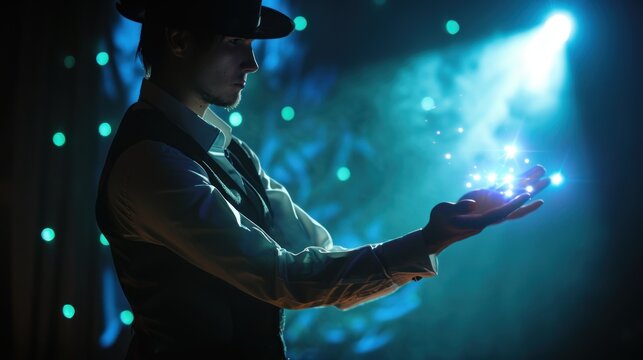 Magician or illusionist is showing magic trick. Blue stage light in background.