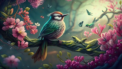 Beautiful art illustration of Sakura blossom with birds cartoon style generative ai