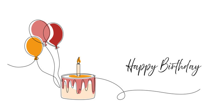 Birthday cake one line drawing in single line art style. Continuous line drawing of birthday cake with candles and balloons editable stroke. Doodle sketch concept isolated. Vector Illustration