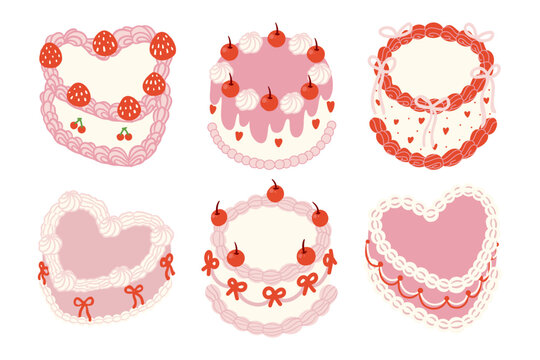 Vintage Cake Pink Tone Vector Illustration with Cherries, Strawberry, Whipped Cream, Coquette Ribbon and Heart