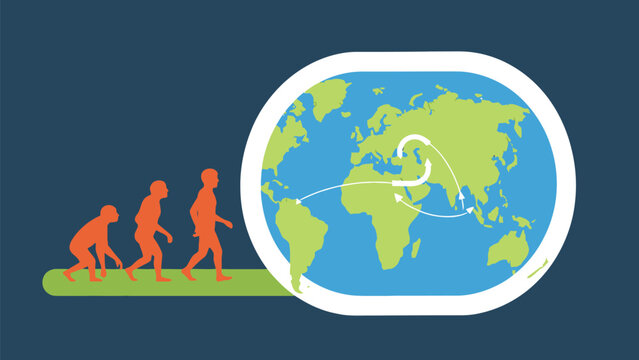 Illustrative concept showing the progression of human evolution moving towards a map depicting ancient migration patterns across continents illustrating global spread.