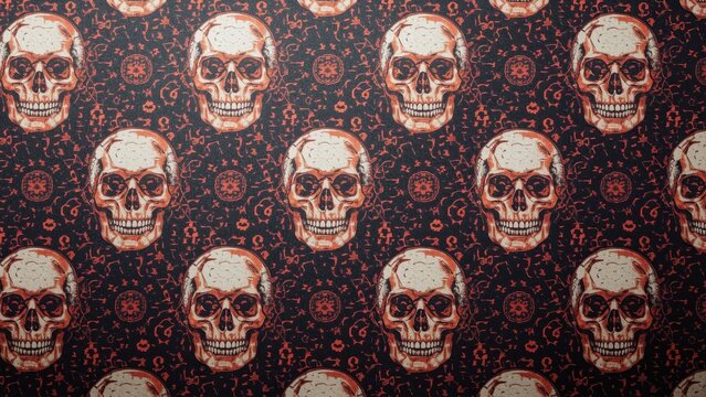 Unique pattern of realistic skulls arranged symmetrically on dark textured background perfect for Halloween decorations, gothic designs, horror themes, and spooky event invitations with moody atmosph