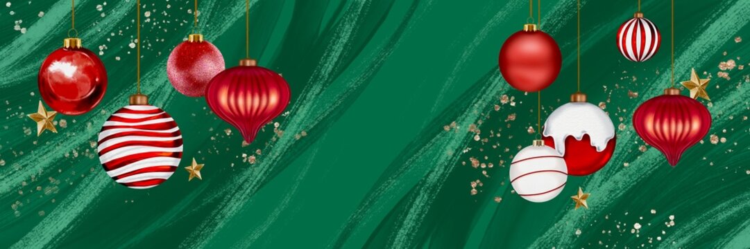 Christmas and New Year web banner with abstract green background and hanging red and gold holiday balls for seasonal celebration backdrop. Hand drawn illustration.