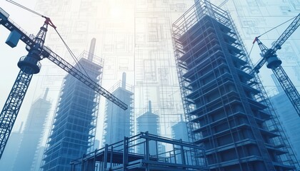 Modern construction site with several skyscrapers under development. Construction cranes visible. Detailed blueprints overlaid on image suggesting strong planning stage, execution of architectural