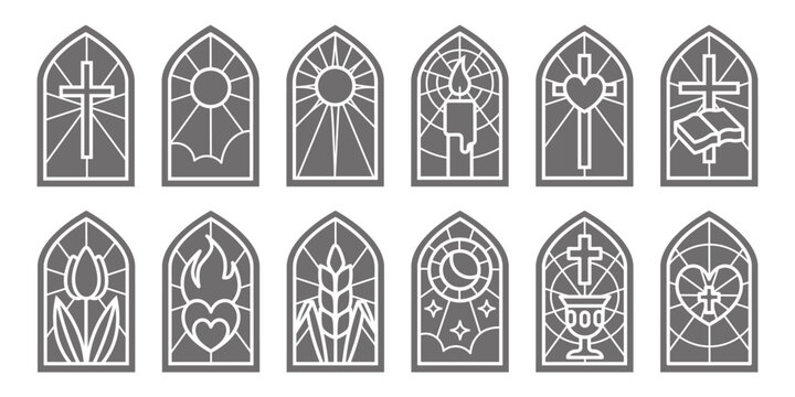 Church glass windows. Stained mosaic catholic and christian frames with cross. Vector gothic medieval outline arches isolated on white background