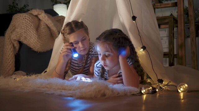 Girl explores with flashlight inside tent while sister reading book under cozy blanket beside string fairy light during sleepover before bedtime creating peaceful imaginative play scene quiet charm