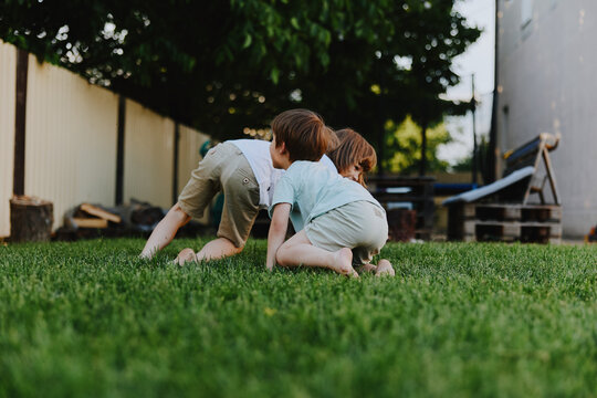 Two playful children crawling on green grass in a sunny backyard, enjoying the warmth of summer while engaging in imaginative play and exploration.