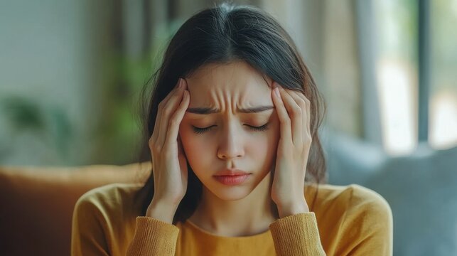 Woman suffering headache due to imaginary problems in pms, hormone imbalance