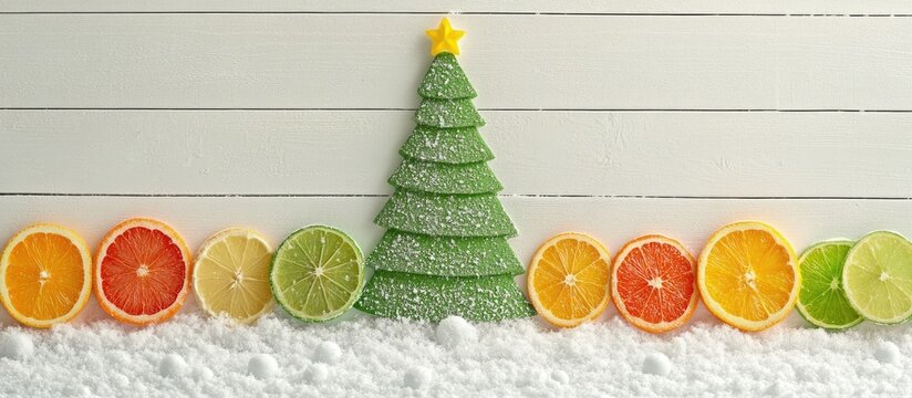 Christmas banner with a green tree crafted from citrus slices on a white wooden background adorned with imitative snow and text space