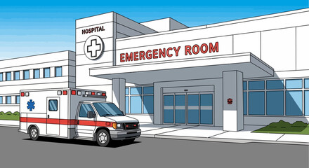 Closeup view hospital emergency room entrance with an ambulance parked outside, highlighting urgent medical care and immediate response