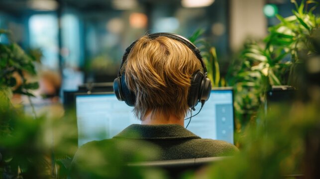 Woman with headphones promoting music event with contemplative mood