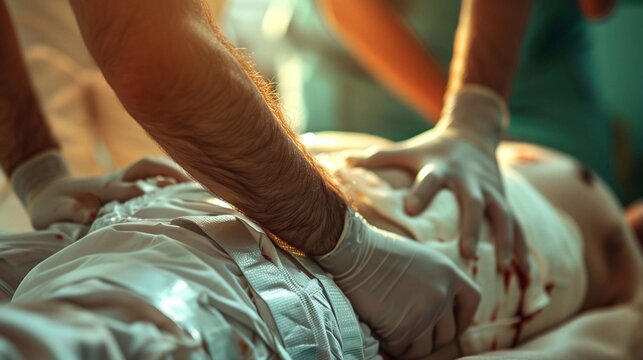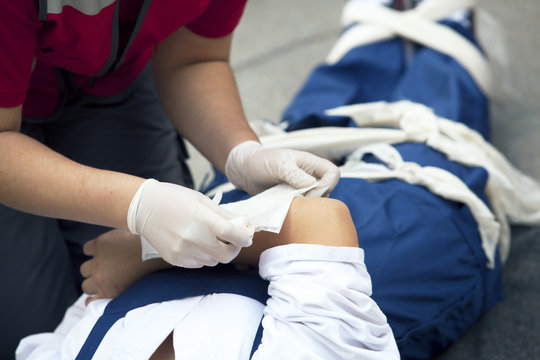 Medical staff are treating an injured person using immobilization techniques