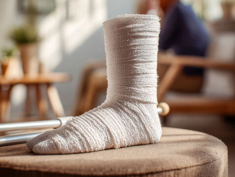 Wrapped lower leg and foot bandage with wooden crutches resting on a cushioned surface in a cozy home setting showing recovery and support for injury