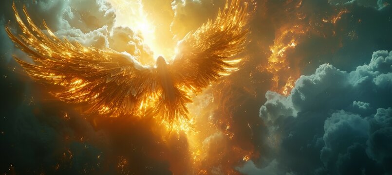 Magical phoenix immortal bird flying. Mythology creature concept. Generative AI technology.