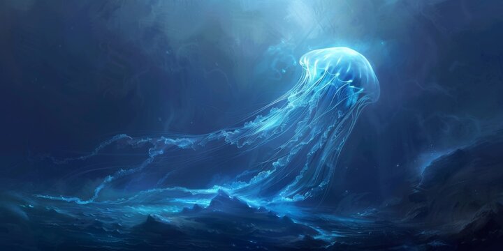 Digital art of jellyfish with ethereal bioluminescence drifting in the deep oceans mystery casting an eerie glow