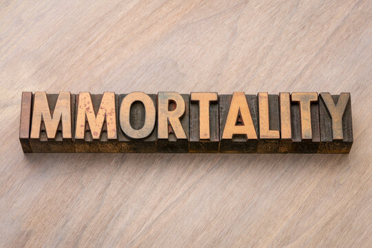 immortality word in vintage letterpress wood type printing blocks, indefinite continuation of a person's existence, even after death