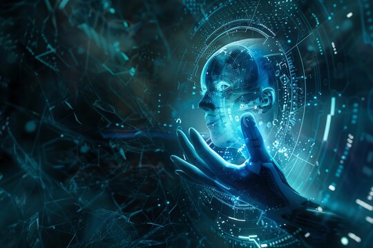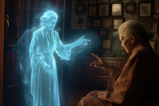 The concept of digital immortality as a woman engages in a conversation with a person whose consciousness has been uploaded to a computer.