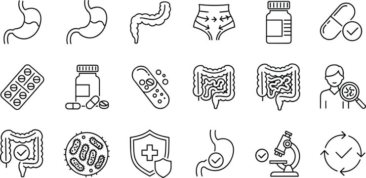 Immune Defense Icons. Outline icon set of immune defense and health: white blood cell, shield icon, vaccine