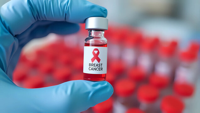 Portrait of person's hand in gloves holding breast cancer vaccine vial with red ribbon symbol, blurred laboratory background - science, medical research, healthcare awareness concept