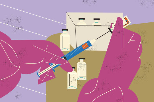 Nurse hand extracting covid-19 vaccine dose from his vial using a syringe. Population immunization campaign.