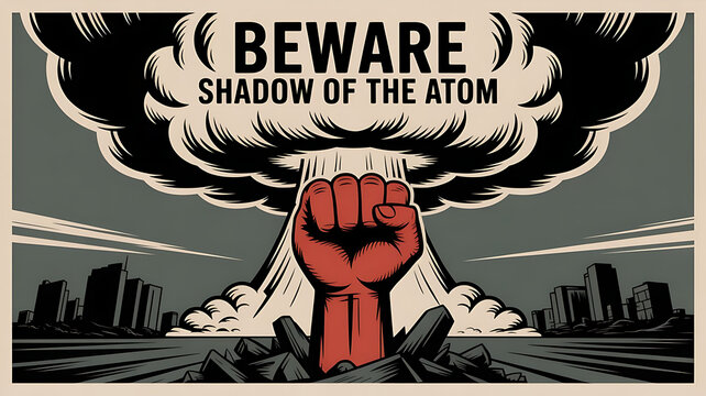 Nuclear Protest Art Illustration: Retro Atomic Explosion and Raised Fist in Dystopian Cityscape – Impactful Graphic Design for Awareness Campaign