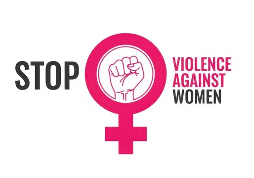 Graphic illustration with the symbol for woman and a raised fist, conveying the message stop violence against women with a bold and impactful design
