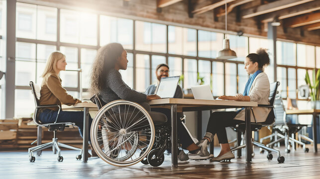 A group of people are sitting at a table in a room, with one person in a wheelchair. The atmosphere seems to be professional and collaborative, as the group is working together on laptops