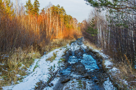 Autumn landscape with impassable mud after rain