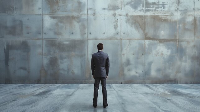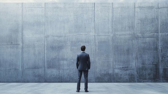 A determined businessman in a suit stands perplexed before a towering wall, symbolizing a sudden, insurmountable obstacle and a dead-end in his career path, with no clear way forward.