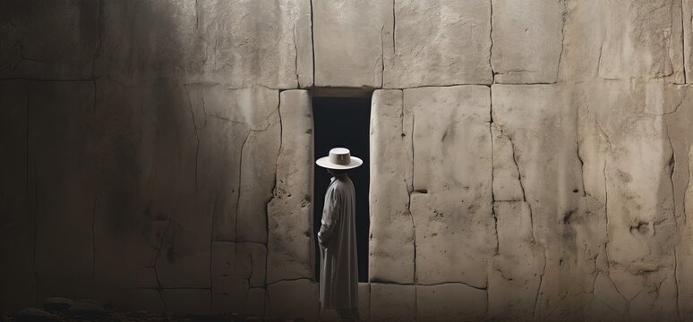 a man looking into the dark narrow way on ancient stone wall, , Generative Ai