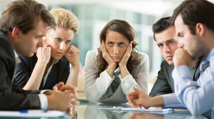 A business meeting with participants looking stressed and overwhelmed by the heated discussion