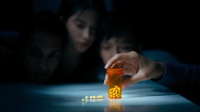 Teens gaze at hand reaching for prescription medication bottle, implying concern about medicine or substance abuse.