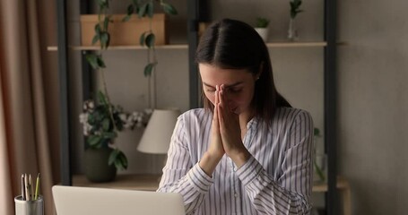 Religious superstitious businesswoman sit at desk fold palms pray to God ask for good luck in business, startup, upcoming negotiations. Woman feels grateful, express gratitude. Faith, religion concept