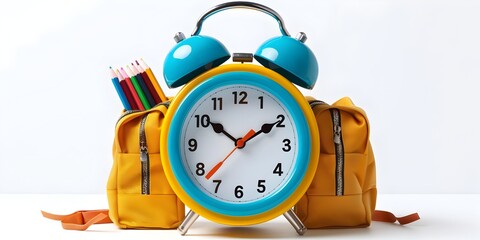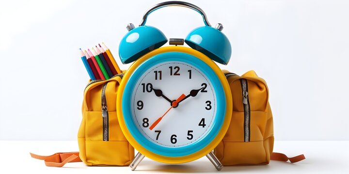A whimsical cartoon-style alarm clock character with backpack and school supplies symbolizing the importance of punctuality