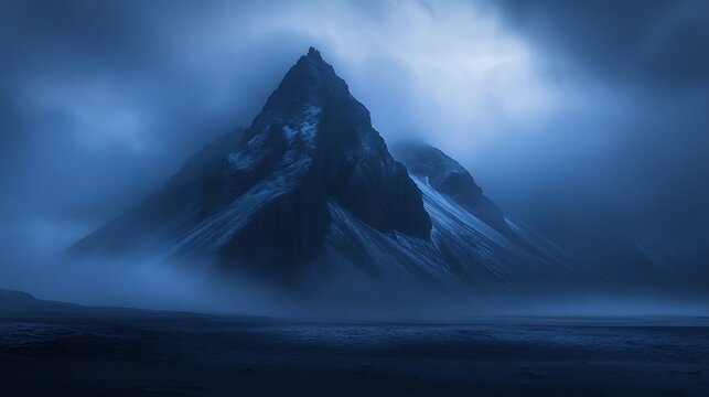 A tall, imposing mountain peak stands against a dramatic, blue, cloudy sky, shrouded in mist.