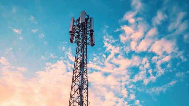 Communication Tower under Blue Sky: A tall, imposing communication tower reaches towards a vibrant, cloud-strewn blue sky.