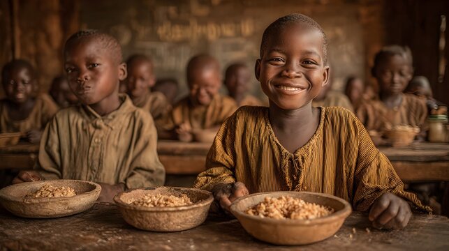 Happy African children are eating simple meals together in a rustic, impoverished classroom setting indoors.
