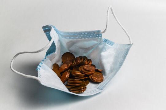 The pandemic purse - Protective mask filled with euro cents, concept to demonstrate the economic impoverishment due to the pandemic