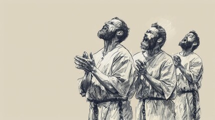 Biblical Illustration of Paul and Silas Singing in Jail, Earthquake Breaking Chains, Beige Background, Copyspace
