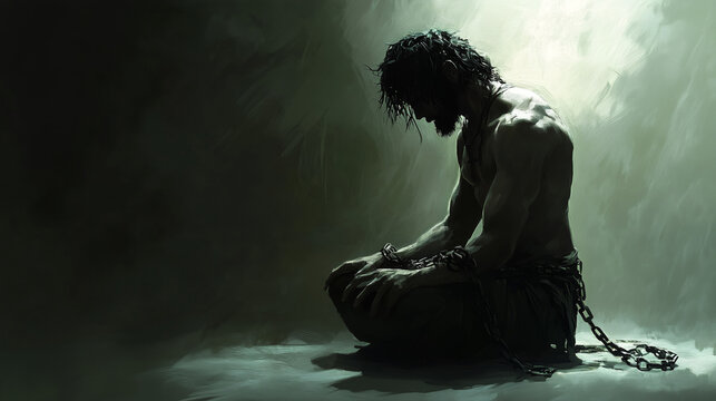 Samson Kneels in Prayer, Bound by Chains in a Dimly Lit Chamber