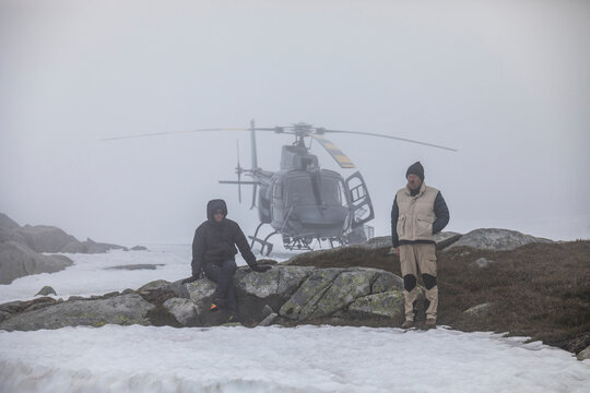 Helicopter pilot and passenger wait for improved weather, stranded.