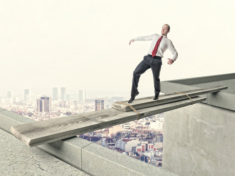 businessman crosses  improvised bridge. concept caution, danger challenge